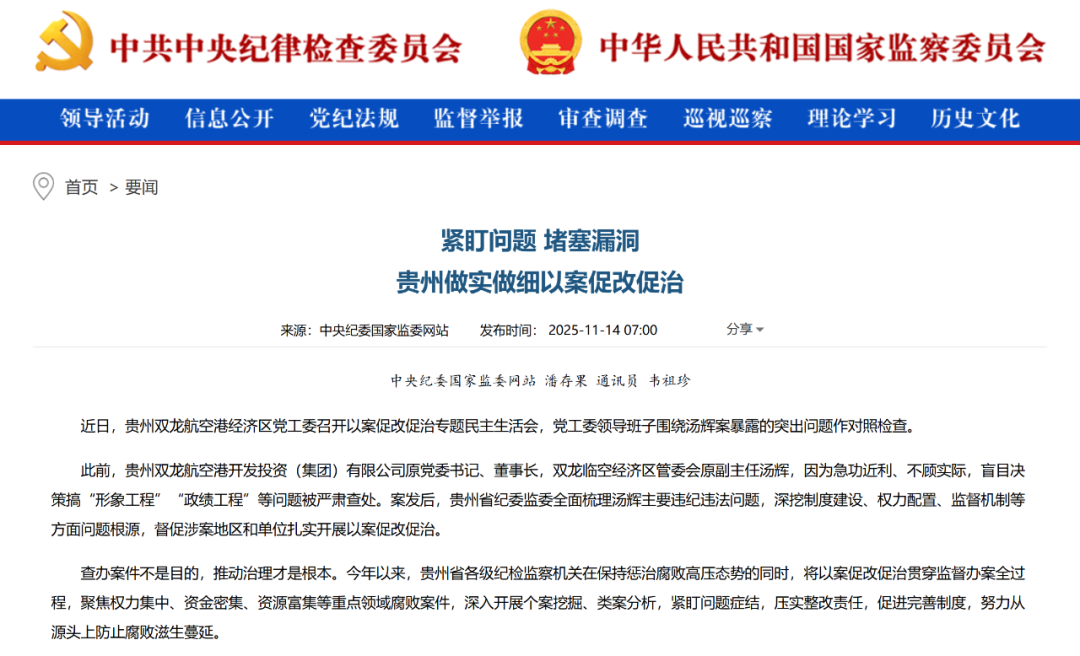 此前,贵州双龙航空港开发投资(集团)有限公司原党委书记、董事长,双龙临空经济区管委会原副主任汤辉,因为急功近利、不顾实际,盲目决策搞“形象工程”“政绩工程”等问题被严肃查处。案发后,贵州省纪委监委全面梳理汤辉主要违纪违法问题,深挖制度建设、权力配置、监督机制等方面问题根源,督促涉案地区和单位扎实开展以案促改促治。